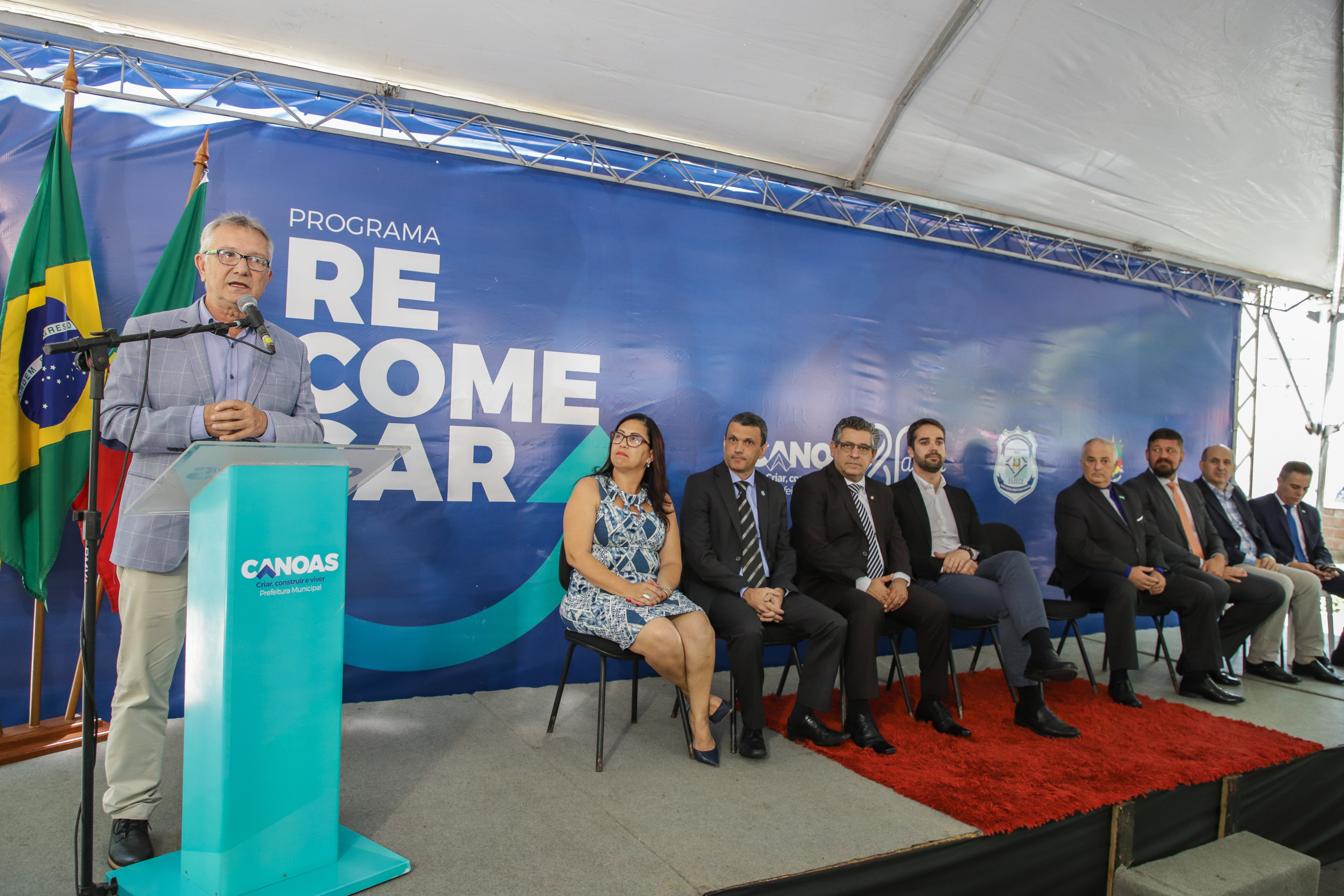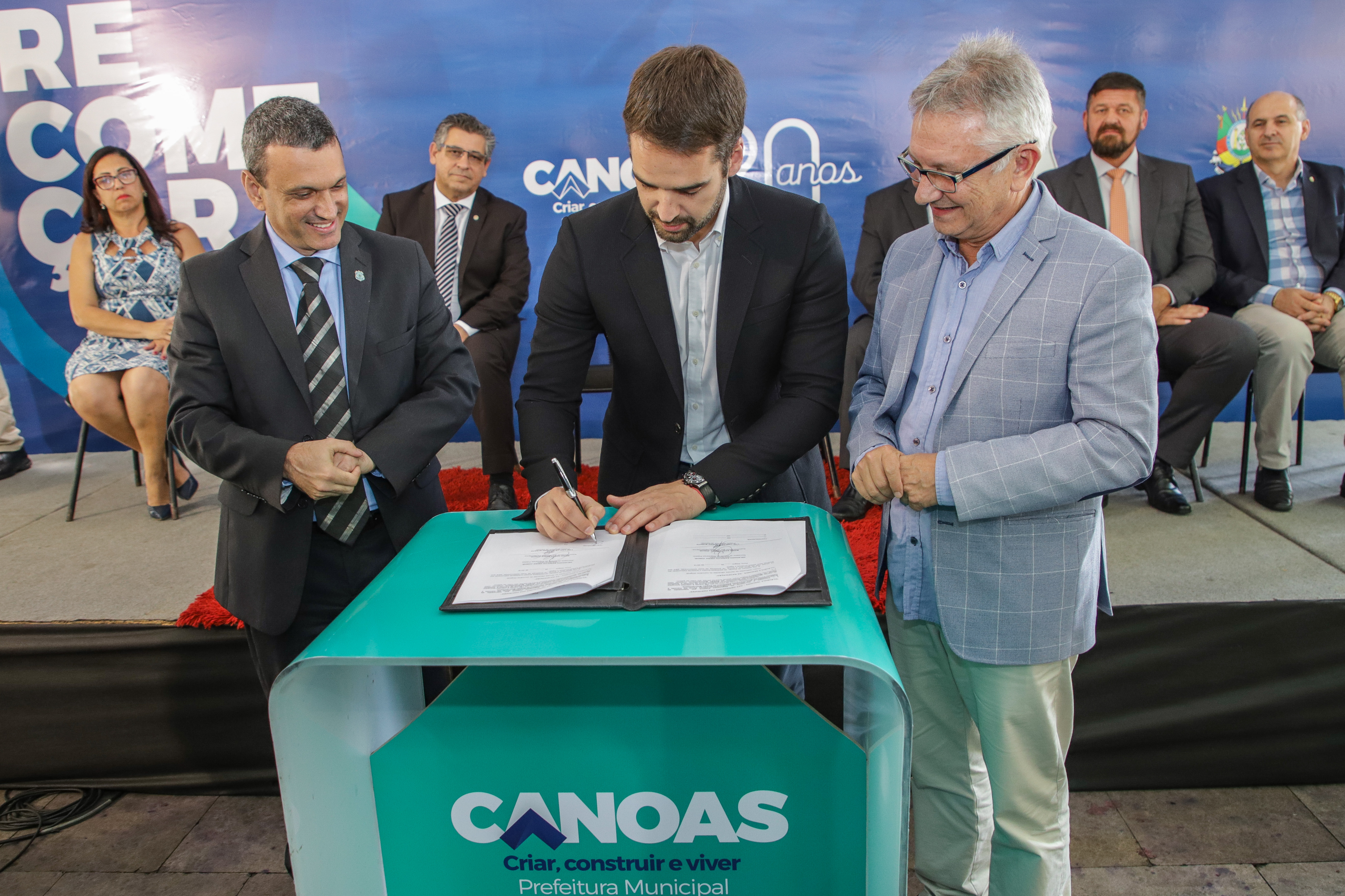 Prefeito de Canoas, Luiz Carlos Busato, oficializou a ampliação do programa Recomeçar, em ato com presença do governador Eduardo Leite