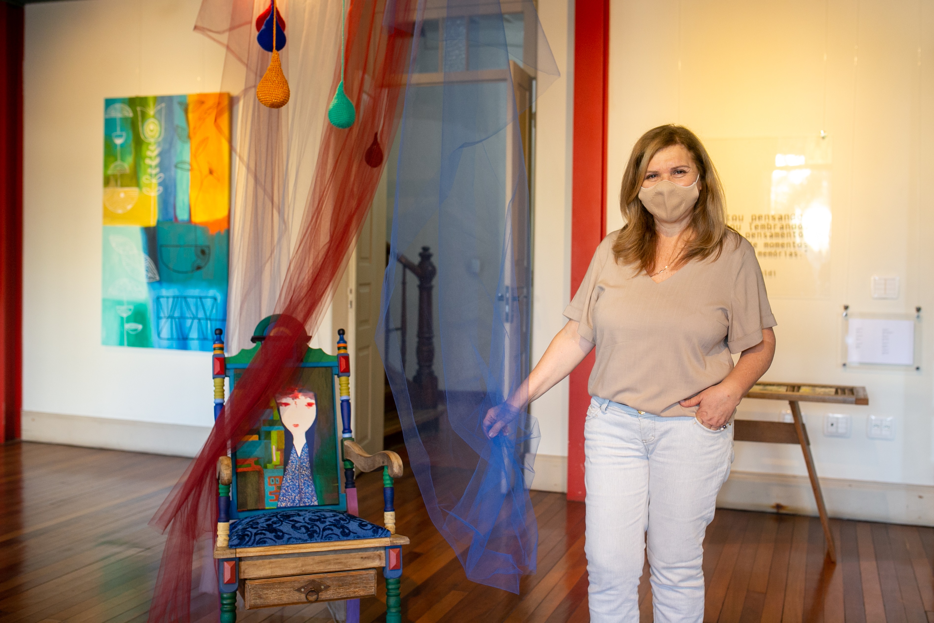 Uma cadeira de balanço que traz a pintura de uma santa, com uma gaveta que traz essências, faz parte dos trabalhos da Visões da Memória. “Essa cadeira lembra essas memórias e os cheiros da minha infância. A arte abre caminhos”, salienta Sonia. A artista garante que o feminino, que pode ser apreciado em aquarelas compostas com colagens, é uma marca nas suas obras. “Precisamos usar a arte para libertar o feminino. As mulheres ainda sofrem muito preconceito”, reflete.