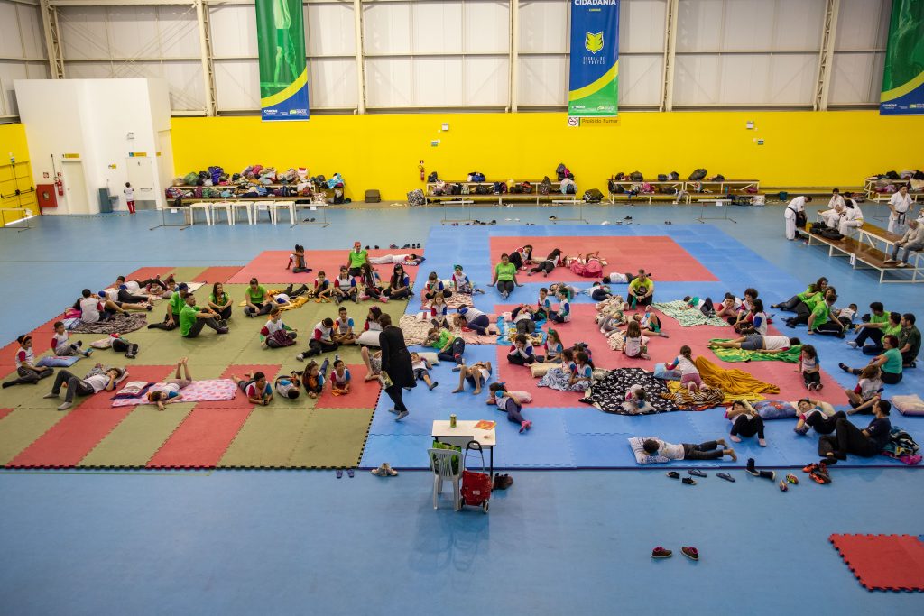 Depois de brincadeiras com estafetas, apresentações de teatro, contação de histórias, arena de lutas com boxe, karatê, judô e taekwondo, um “minipan”, como nos Jogos Panamericanos, circuitos de ginástica rítmica e artística, aula de ritmos, cineminha e até um desfile de pantufas, eles foram acordados, na manhã desta sexta, pela corneta colorida e barulhenta da secretária Bárbara Marconato.